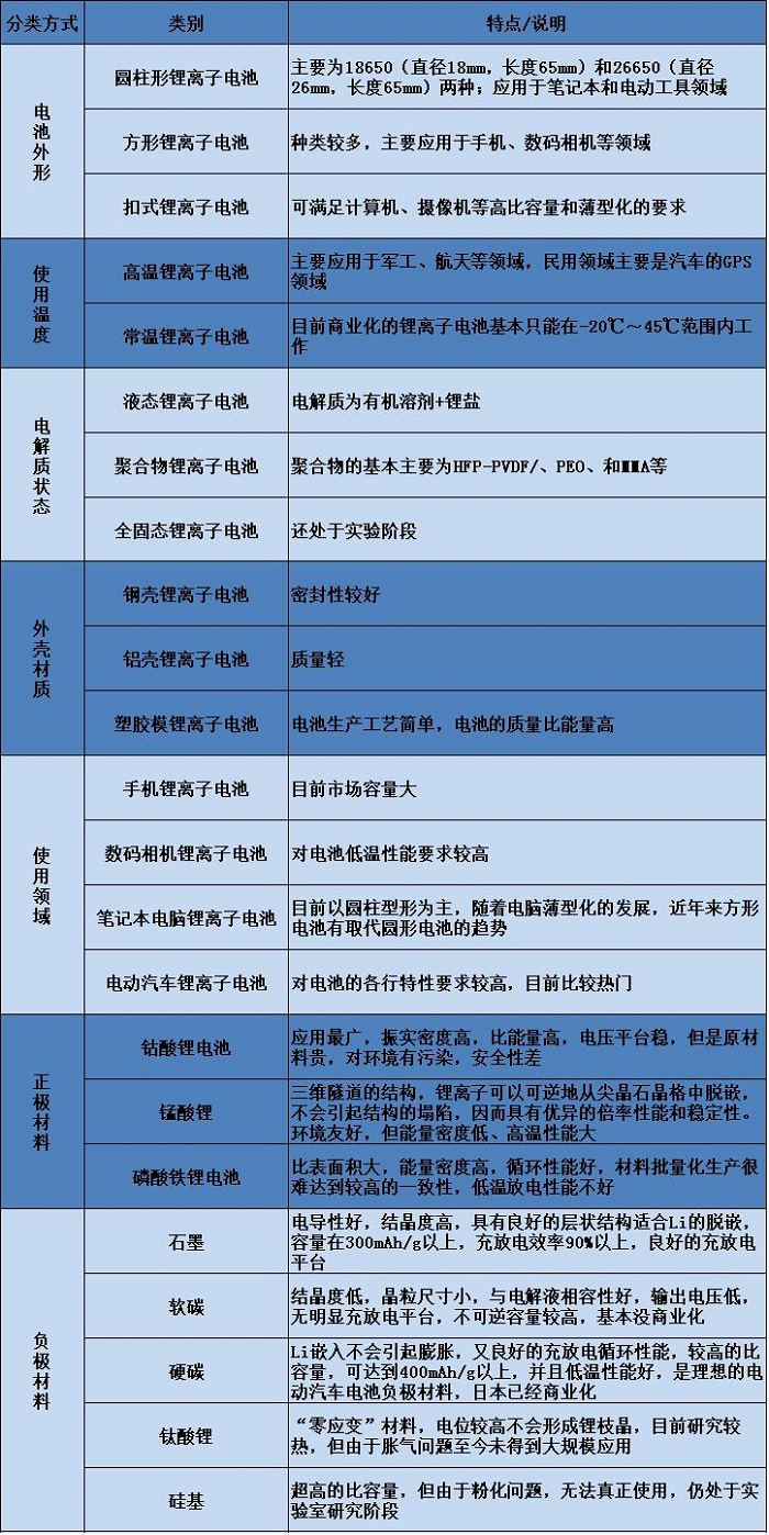 四、鋰離子電池的主要分類