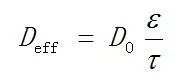 多孔電極中,除孔隙率之外,孔隙迂曲度也是與傳輸特性相關(guān)的一個(gè)重要參數(shù)。有效擴(kuò)散率、傳導(dǎo)率等 Deff輸運(yùn)物性的關(guān)系可用式(3)表示: