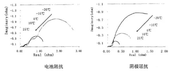 電池阻抗主要體現(xiàn)為電化學反應阻抗,而歐姆阻抗相對較小。由下圖可知。隨著溫度的下降,電池阻抗逐漸上升,且下降至0°C以后,阻抗速度增大,陰極阻抗呈類似的趨勢,從數(shù)值上來看,電池的阻抗主要來源于陰極阻抗的貢獻。