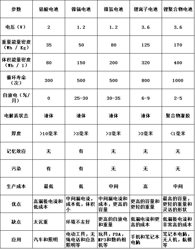 下表比較了它們的性能和應(yīng)用。目前,最受歡迎的可充電電池是消費(fèi)電子行業(yè)中的鎳鎘電池(Ni-Cd),鎳氫電池(Ni-MH)和鋰離子電池Li-Ion。