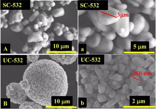 目前鋰電池的三元正極材料的顆粒是由一次顆粒團(tuán)聚而形成的二次顆粒球,直徑通常在幾微米至十微米之間,一次顆粒的大小一般為幾百納米(如圖1B-b所示)。而單晶(single-crystal or monocrystal)三元正極材料的顆粒均為分散的一次顆粒,粒徑通常在5μm以下,也有文獻(xiàn)報(bào)道過(guò)納米級(jí)的單晶顆粒,沒(méi)有團(tuán)聚而成的二次顆粒存在(如圖1A-a)。這種獨(dú)特的微觀形貌使得單晶三元材料相比二次球材料有著許多優(yōu)勢(shì)。