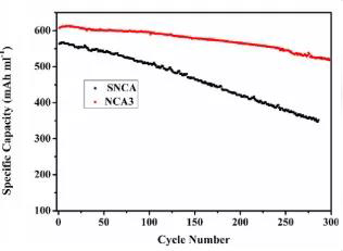 圖2 (a)商業(yè)化球狀NCA顆粒(b)單晶NCA經(jīng)過(guò)100次循環(huán)后;(c)循環(huán)穩(wěn)定性對(duì)比。