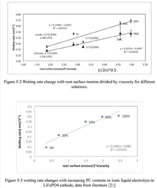 論文還討論了溶劑與添加劑對電解液浸潤速率的影響,具體結(jié)果如表5-1和5-2所示,具體揭示可以參照公式2-1b。據(jù)了解該博士論文作者目前在ATL任職。