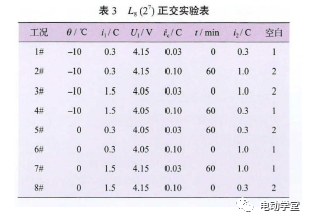 設(shè)計(jì)L 8(2的7次方)正交實(shí)驗(yàn),通過(guò)8次實(shí)驗(yàn),可以在不影響主要結(jié)果的前提下既避免了6個(gè)因素在2個(gè)水平下的全因子大量實(shí)驗(yàn)又可獲得各個(gè)因素對(duì)老化速率的影響?空白列可以作為實(shí)驗(yàn)誤差列用于判斷實(shí)驗(yàn)結(jié)果的可靠性。L8(2的7次方)正交實(shí)驗(yàn)下各個(gè)工況的實(shí)驗(yàn)參數(shù)如表3所示。