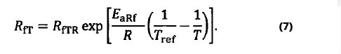 實(shí)驗(yàn)結(jié)果表明電池在循環(huán)過(guò)程中,A~D這4個(gè)位置在電池表面處的溫度隨時(shí)間變化,在該低溫循環(huán)條件下,4個(gè)位置的最大溫差在2℃以?xún)?nèi)?R film是對(duì)溫度較為敏感的參數(shù),其隨溫度的變化通??梢岳冒⒗勰釣跛龟P(guān)系式來(lái)表述: