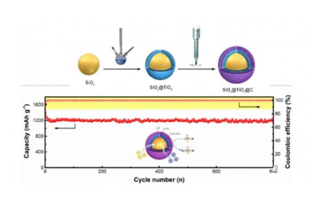 圖1 SiOx@TiO2@C復(fù)合物的制備及循環(huán)特性