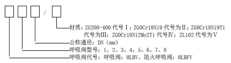 標記示例:公稱通徑DN100、主體材料ZL102帶吸入接管阻火呼吸閥標注:HLBFV2-100/Ⅴ。