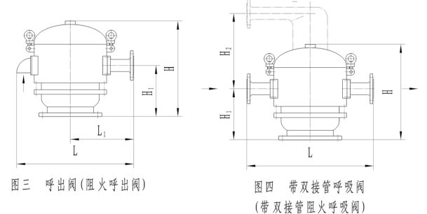 4)HLBV4(HLBFV4)型呼吸閥(阻火呼吸閥)見表三、圖四。