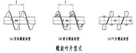 ⑴螺旋輸送機(jī)的螺旋葉片有實(shí)體螺旋面型、帶式螺旋面型及葉片螺旋面型三種,分別如下圖(a)、(b)、(c)所示。實(shí)體螺旋面稱為S制法,其螺旋節(jié)距為葉片直徑的0.8倍,適用于輸送粉狀和粒狀物料。帶式螺旋面又稱D制法,其螺旋節(jié)距與螺旋葉片直徑相同,適用于輸送粉狀及小塊物料。葉片式螺旋面應(yīng)用較少,主要用于輸送粘度較大和可壓縮性物料,在輸送過程中,同時(shí)完成攪拌、混合等工序,其螺旋節(jié)距約為螺旋葉片直徑的1.2倍。